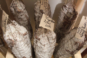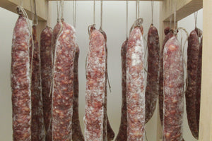 C'est l'étape clé qui définira les saveurs des salaisons façonnées par nos soins. Elles prendront le temps de sécher dans notre séchoir attenant à notre atelier et visible de notre boutique.