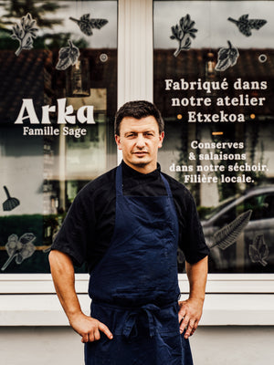 Tristan à plusieurs cordes à son arc. De formation charcutier et cuisinier au lycée hôtelier de Mazamet puis boucher. Il incarne l'amour du métier et la rigueur de l'artisanat. Fort de plus de 30 ans d'expérience . Après son poste de second de cuisine au Café de Paris à Biarritz dans les années 2000, puis de passage en Corse et quelques années en Bretagne en tant que chef cuisinier, Tristan pose ses valises à Sare au Pays Basque en 2010 à la tête de la boucherie du village. En 2021, Tristan et Marianne son épouse décident de créer Arka, un lieu au coeur du village de Sare, un lieu atypique ou se trouve dans la même maison l'atelier de fabrication et son séchoir , une boutique attenante et le bistrot gourmand avec la terrasse face à la Rhune. Chaque jour, il met son savoir-faire au service de la transformation de la totalité des produits de notre établissement, garantissant une qualité exceptionnelle et un respect profond des traditions.